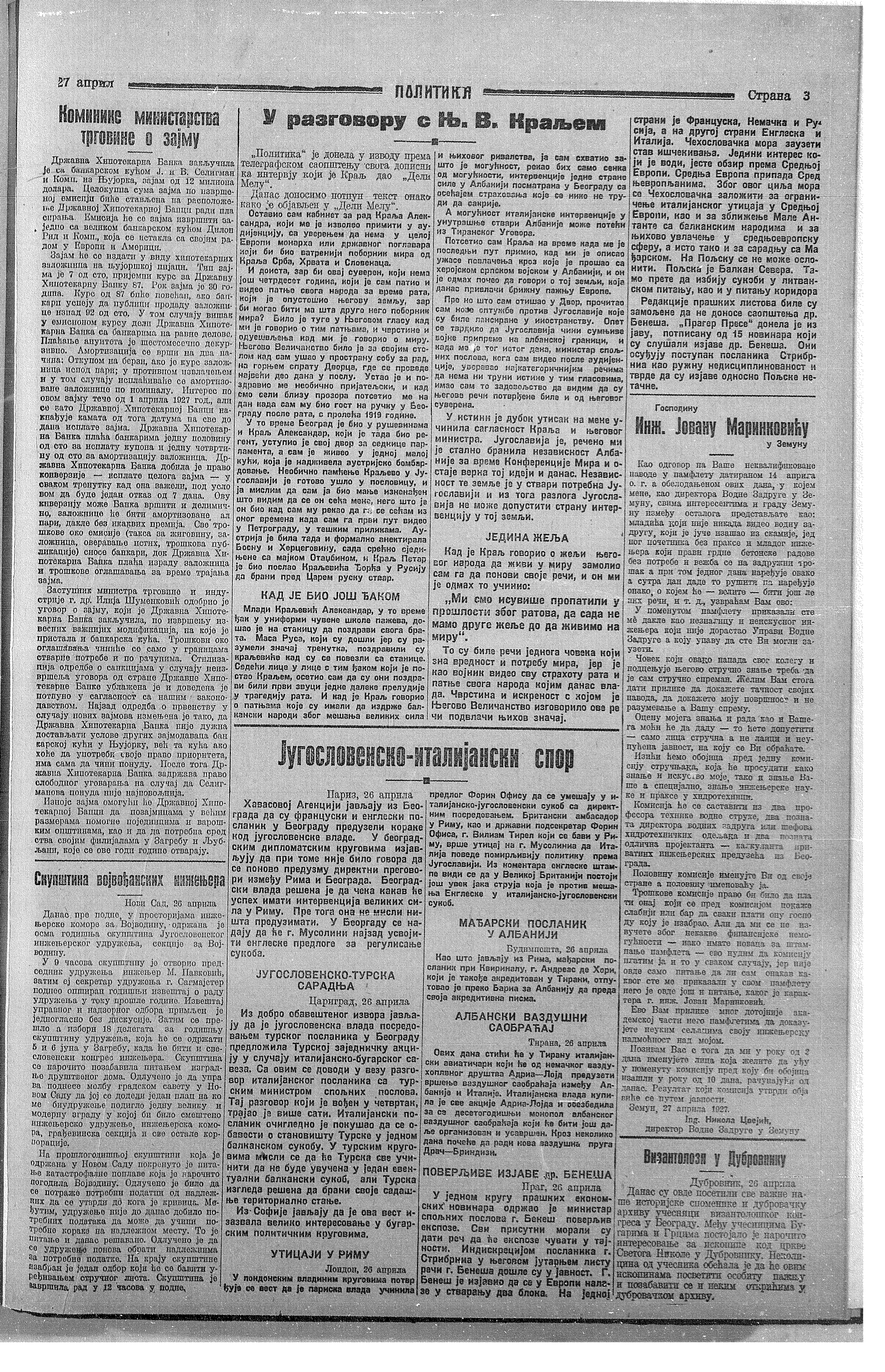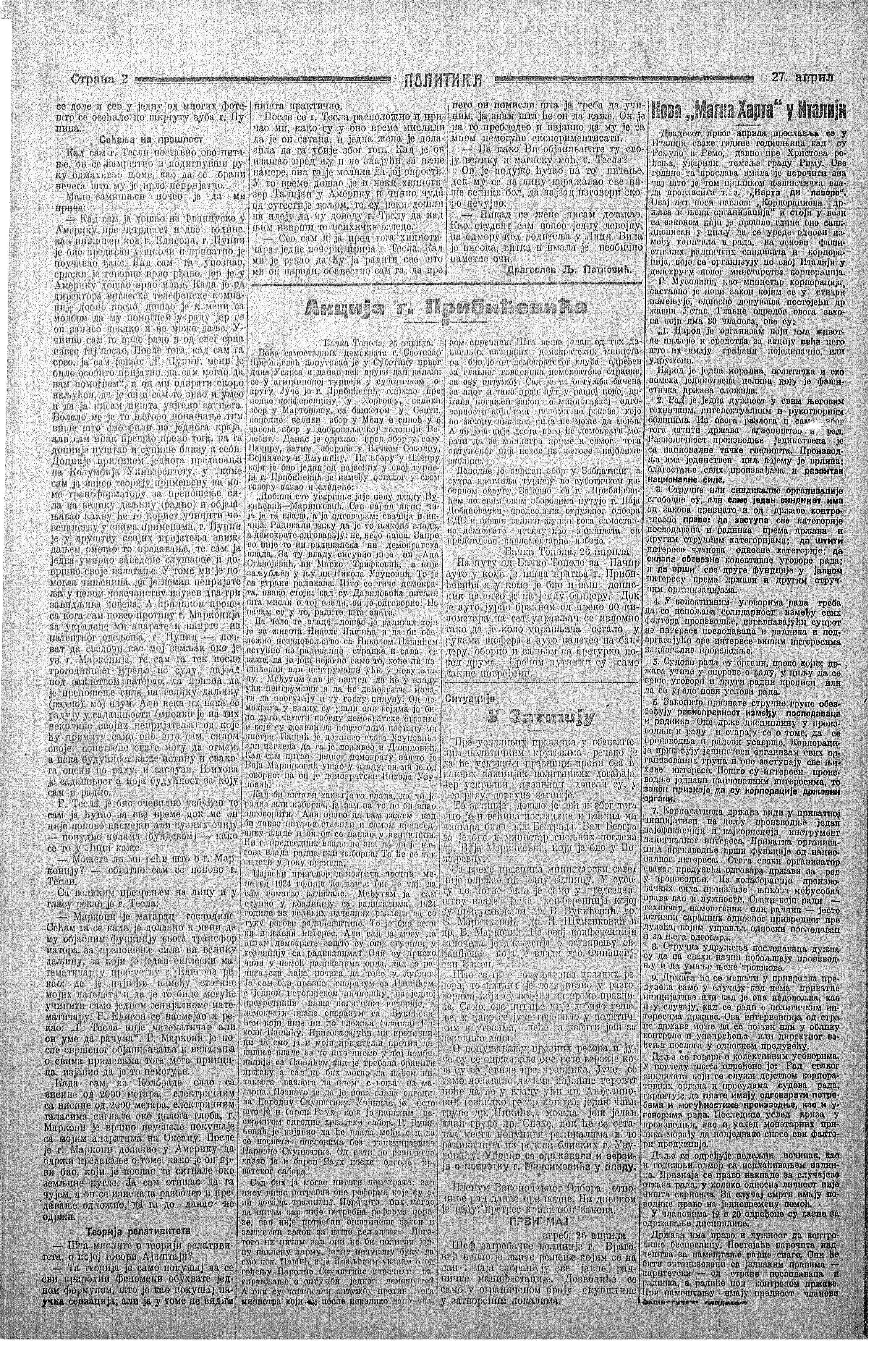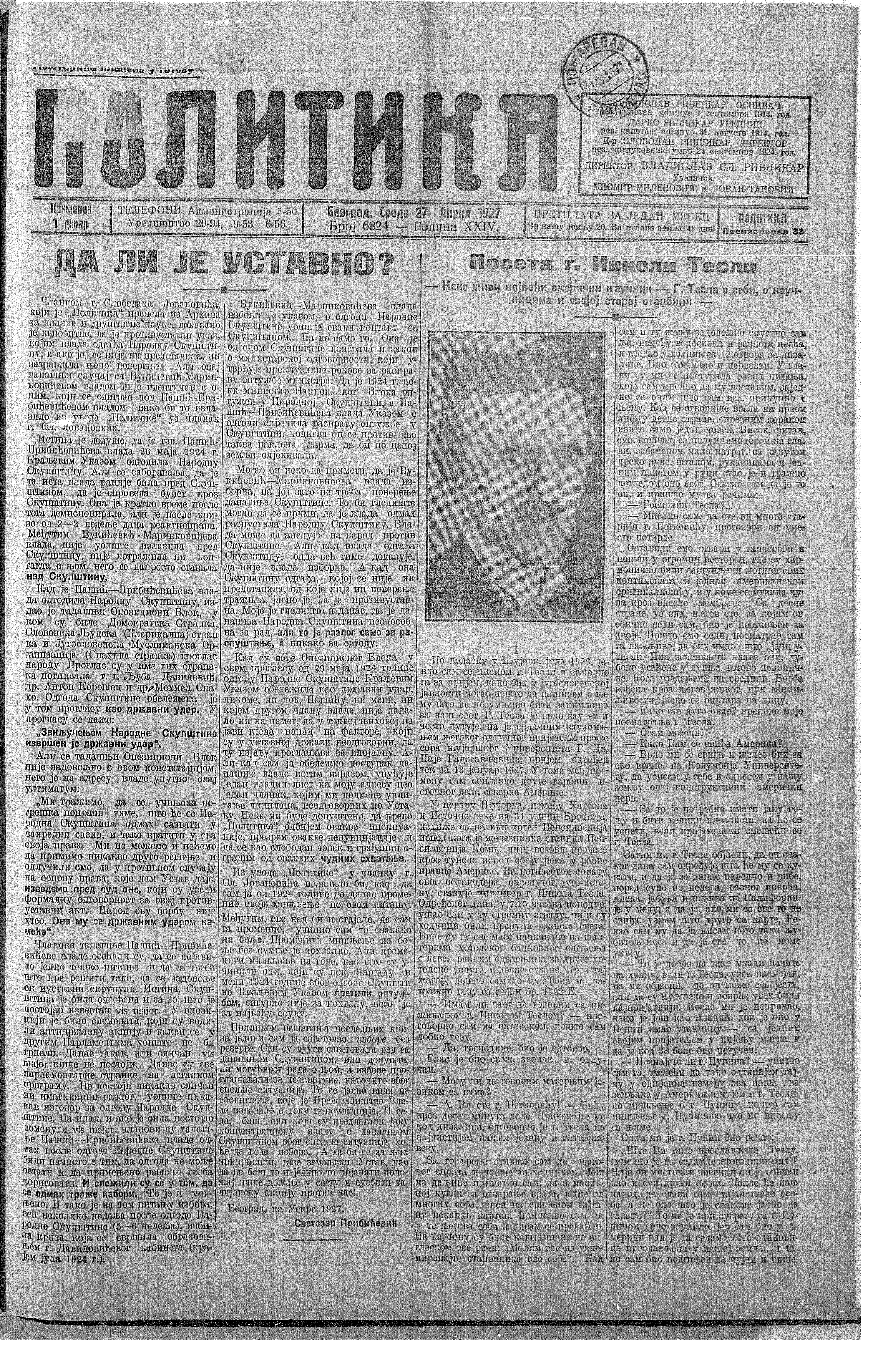 Nikola Tesla, 1927 Nikola Tesla Interview in "Politika”